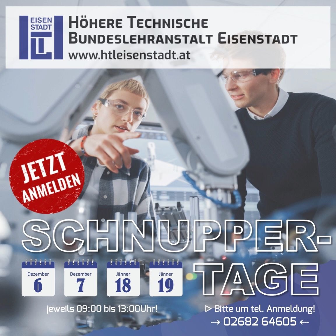 Jetzt anmelden – telefonisch (02682 64605) oder per Mail (direktion@htleisenstadt.at).